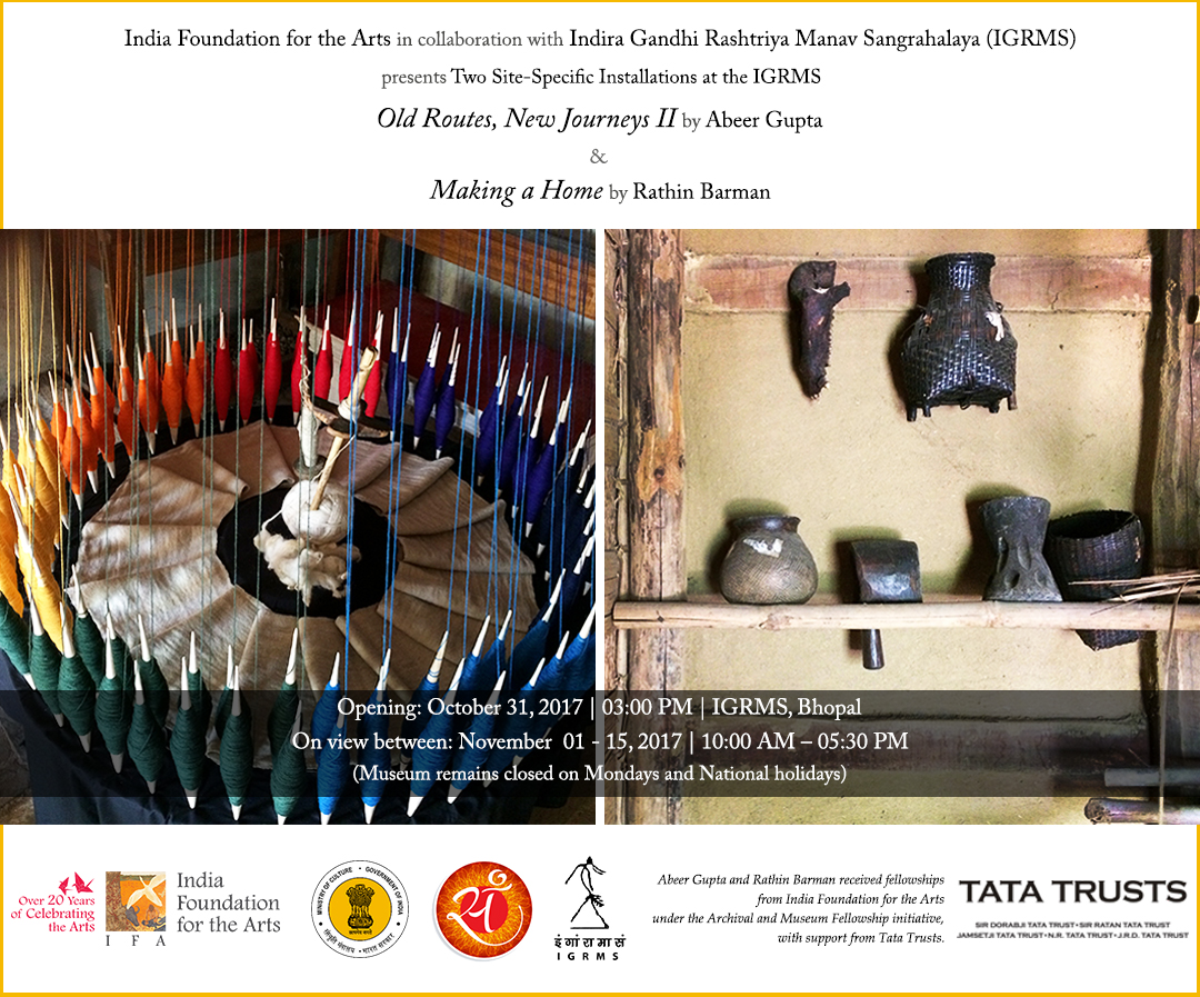 Join us for the opening of two site-specific installations - Old Routes, New Journeys II and Making a Home - by Abeer Gupta and Rathin Barman respectively, at the IGRMS, Bhopal on Tuesday, October 31, 2017!
