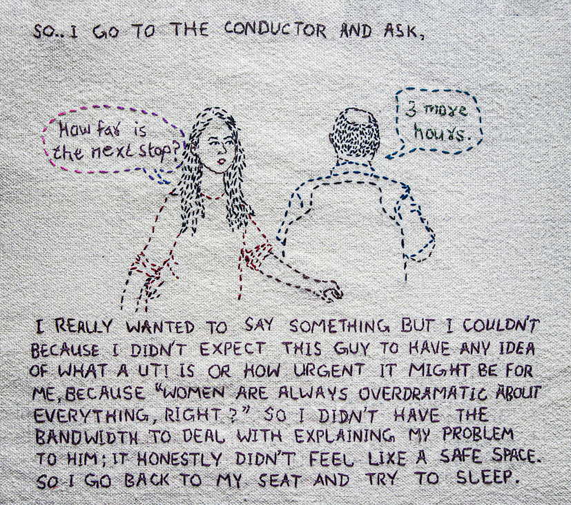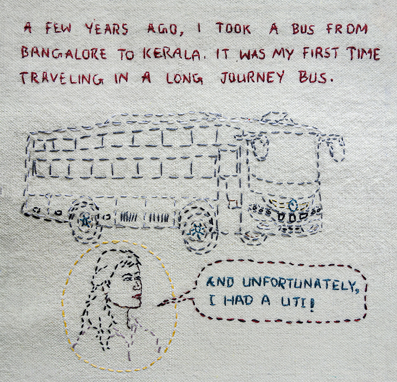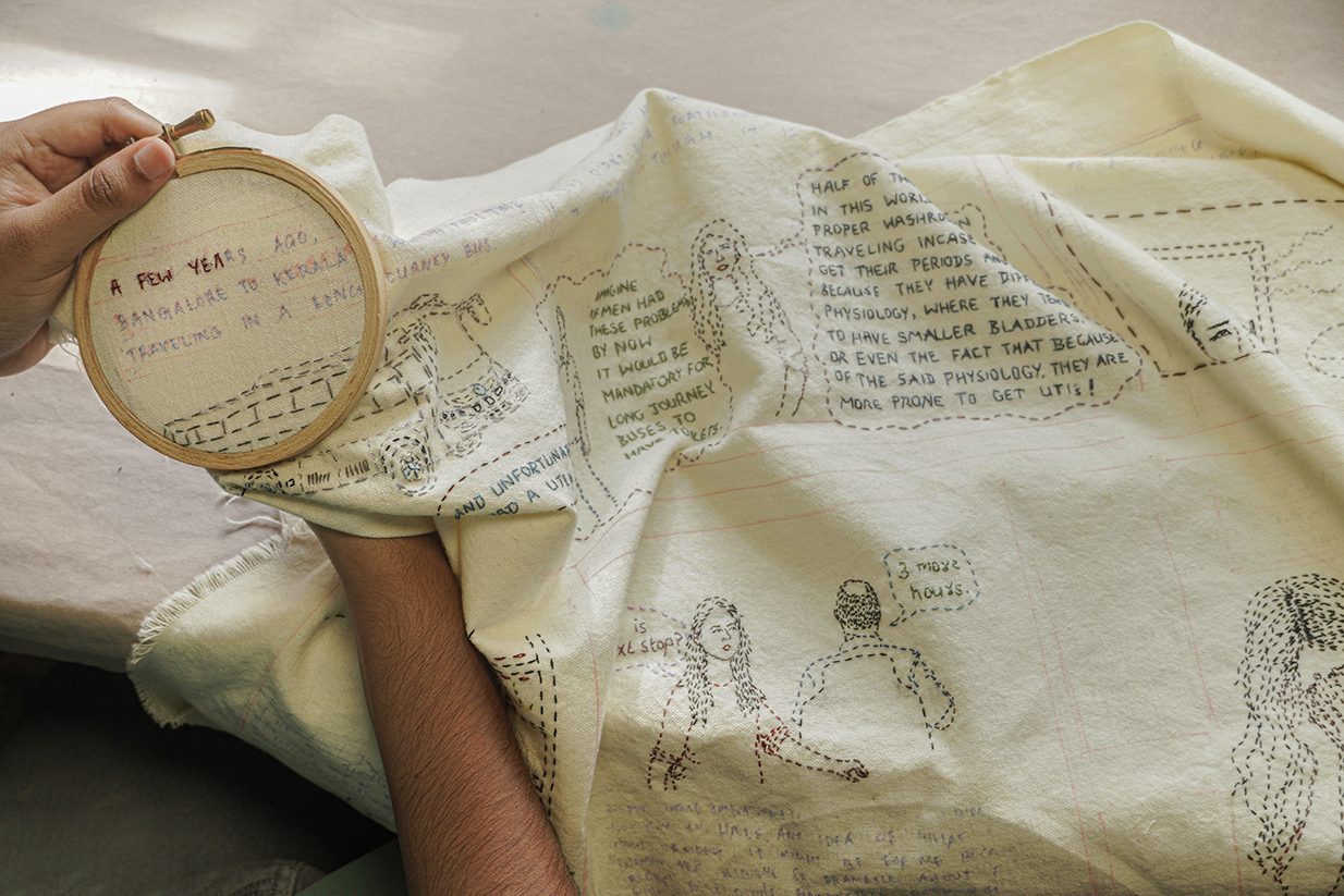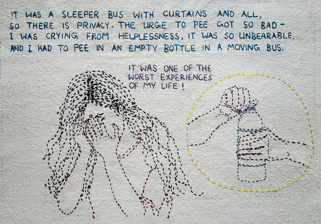 This project will involve the making of graphic narratives juxtaposed with multi-media literary explorations including mediums of textile, sculpture, drawing, cut-up text and video incorporated into a large book-form. The content for this mixed-media literary exploration will be through collecting shared experiences of women and queer people, including the trauma associated with deeply personal experiences, such as urinating in public spaces, and the stigma associated with it. The project is located in the socio-political context of women with complications of menstruation and prone to urinary tract infections, the lack of clean toilets, as well as the social stigma associated with their bodies, and the fear of male gaze preventing them from having the liberty to urinate in spaces that are so readily accessible to men for the same purposes. The emotional affect of these collected experiences can range from humour, to traumatic to tragicomic.