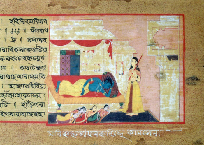 Mr Boruah, a visual artist and art historian, who currently occupies the position of Guide-Lecturer-cum-Exhibition Officer at the Assam State Museum in Guwahati, devotes a good part of his proposal to theories about the origin of the manuscript paintings of Assam. He traces the first reference to inscriptions on bark originating from Assam to Banabhatta’s seventh century Harshacharita, where mention is made of gifts sent to Harshavardan by the Assamese king, Kumar Bhaskarbarman. While evidence suggests that manuscript writing on palm leaves and birch bark was prevalent among the Buddhists and Jains as far back as the fifth and sixth centuries respectively, Mr Boruah would like to consider the possibility that Assamese manuscript writing did not draw on these precedents. He bases this view on the fact that the technique of preparing palm leaves and birch bark as a writing medium is not as complex as preparing aloe bark, which is the oldest writing material of Assam. He conjectures, therefore, about an older Aryan tradition of manuscript writing, which might have come to Assam with the earliest wave of Aryan migration.