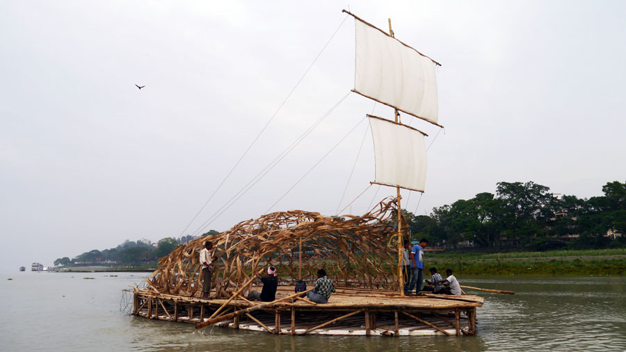 Much of Indrani’s earlier practice related to sustainability. Drawing upon her early years in Assam, she stresses that the imminent shortages of land, water and energy continue to increase the pressure to find innovative solutions in the North-East. In ‘Cultural Re-imaginations-II’, Indrani proposes to build a raft based on the sustainable principles of the itinerant vernacular bamboo rafts of the region, conceptualised as a ‘sustainable habitat’, which will sustain up to five individuals at a time over a series of riparian journeys. Indrani will visualise the raft structure functioning as a ‘vessel’ or a ‘receptacle’ for ideas, processes and innovations, and ultimately as a site for creative introspections and collective cultural experiences. The raft structure will be a poetic antidote to the motorised ferryboats and water taxis that are most conspicuous, currently. The design will explore sustainable opportunities for foraging, cooking, living, sleeping, composting as well as energy, food, art, music, crafts and cloth production.