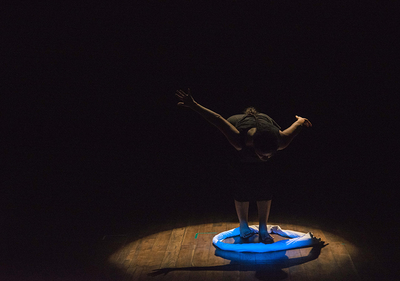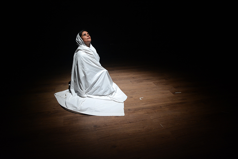 The piece is titled Black Hole. The premise of the piece is a recurring dream that haunts the protagonist, where she finds herself at the edge of a massive black hole, waiting to be sucked in. But the black hole, instead of pulling her in, stares back at her, waiting for her to take the first step, a step that she is unable to take. Throughout the piece, this dream of standing at the edge of a black hole will be woven through smaller narratives and principles from physics where the text will be intertwined with mathematical equations, scientific principles and definitions which will bring in different textures of language. The idea is to create varied emotional landscapes. A single white bed sheet will be the only prop and co-actor for this piece, and the images created with the materiality of the sheet and the body will keep changing the visual landscape of the work. In terms of music and sound design, the attempt will be to create a textured sonic background. Projection mapping is another new element that this piece will explore in order to give the visual element a lyrical quality, allowing for a more subjective and visceral entry point into the piece.