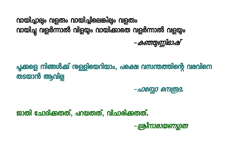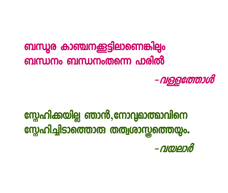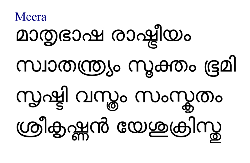 With a history of over 1600 years of evolution of a rich phonetic collection of the language and sign system for its inscription on various mediums, the complete set of Malayalam script evolved for printing in 19th century with the help of movable types - designed by Benjamin Bailey, a Jesuit priest. It retained its rich heritage in conformity with the fundamental structure of other Indian scripts and was adopted widely in printing. Bailey’s script was taught in schools in Kerala until as late as 1970 when a new script was introduced in the pretext of introduction of typewriters. Though typewriters were welcome, the adoption of this new script was seen as an act of assertion of power by the government that caused dissents. Further, the non-systematisation of this new script created tremendous confusion in the language and its learning process right from its inception. Attempts to solve the confusions created further chaos until the formation of Rachana Akshara Vedi Movement, which re-introduced the original character set in Malayalam computing. The movement designed the Rachana font and an editor package capable of creating all the traditional conjuncts followed by Meera Unicode font in 2006.