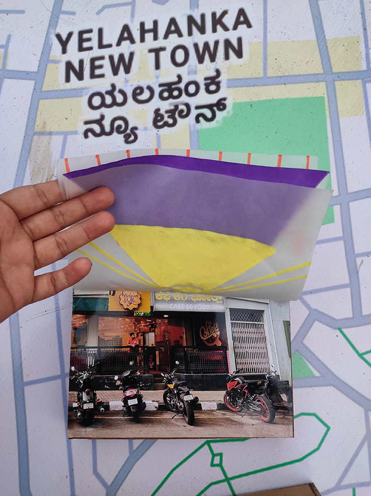 To elicit memories of the neighbourhood, Lakshmi will take the participants through two mapping exercises – a) personal memories of the neighbourhood; b) memories of lost establishments. For the former, Lakshmi will print out small maps of Yelahanka and have the participants map their own memories of specific geographies of the neighbourhood by marking points, writing, drawing or even sticking memorabilia, stones, sand, flowers or leaves on these maps. In this way, the residents’ memories will be documented and mapped. For the latter, the memories will be mapped on a large scale physical map of Yelahanka. Current photographs of specific locations will be superimposed with drawings of establishments that used to exist there earlier.