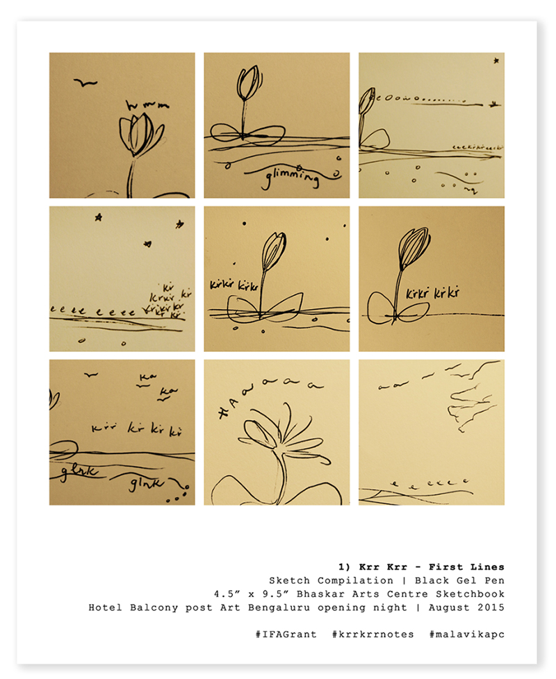 In her current project, tentatively titled Krr Krr, Malavika wants to challenge the idea of children’s book and the canonical understanding of their production. The mainstream publication industry avoids abstractions and contemplations when it comes to children’s books. The ideal reader of the children’s book is imagined to have a simplistic understanding of their surroundings. Through the conventional ‘workbook’ type publications, they are pushed to do ‘activities’ with their time in a prescribed way. ‘Idling’ is often ridiculed in children’s books. The books are reduced to a tool to deliver a ‘message’. Malavika wants to question this popular understanding by making a book in collaboration with children. The book will be a fully illustrated picture book that observes a lily in a pond from sunset to sunrise, noting subtle changes and shifts in the environment. By setting up a time-lapse camera she wants to record these subtle changes and then explore the ambient sights and sounds like a graphic score. The movements and sounds in the surrounding will be illustrated typographically with reference to this apparently still frame. She will take help of a specialist in coastal water bodies of South India for this research phase.