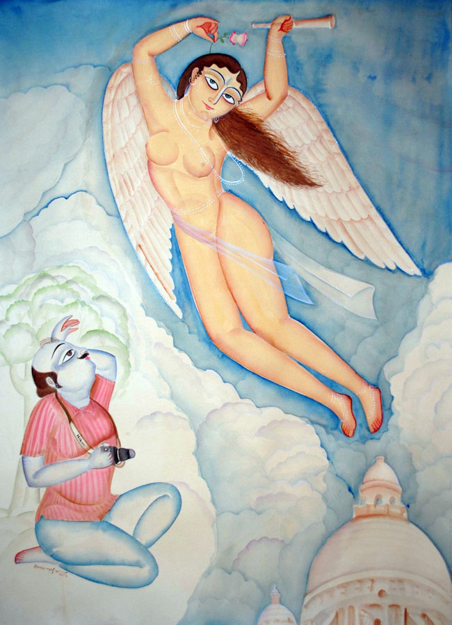 Linked with this, Mousumi’s detailed reading of Kalam Patua’s iconography will give us insights into how the patua moved from the locale of the sacred to the profane as a fallout of its relocation within the city. According to Mousumi, the polyphony and multiculturalism of the city, and particularly its market economy, functioned as ‘contact zones’ for a traditional artist such as Kalam, sparking off a hybrid aesthetics, marked by multiplicity of styles, themes and medium. For instance, Kalam’s representation of women’s sexual bodies, male and female nudes and semi nudes—though working within the aesthetic economy of the traditional patua—reveals a modernist interiority unknown in the Kalighat pat paintings. Also interesting is the wide range of subjects and sites that have become part of Kalam’s contemporary oeuvre, such as the exploration of homosexual and homosocial relations, the figuring of apparatuses of viewing such as mirror and camera, images of the 9/11 tragedy, rickshaw pullers in the city and so on.