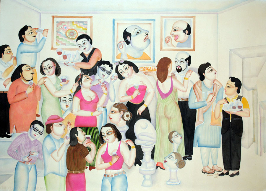 Following from this, Mousumi intends to read Kalam Patua’s paintings as the site of ‘ceaseless and manifold’ conflict between the folk and the modern that layers the paintings with complex messages. In some of Kalam’s paintings, notably ‘Sneaking Into the Mirror’ and ‘Nectar of Her Body’, the satirical ‘babu’ figure of the patua tradition undergoes a second self-reflexive, parodic shift, where the nude babu affords a comment on the patua itself, which then becomes the site of recovering Kalam Patua’s signature modernist style. A similar modernist motif of irony is at work in other paintings in the way Kalam takes on the male gaze of the patua tradition with its proliferation of voluptuous female bodies intended for a lowbrow market. In Kalam Patua’s rendering, the voyeuristic gaze of the male and female nude subjects is reflected back through the mirror into which they gaze, thus offering the possibility of modernist subjectivity, as well as a critique of modernist self-absorption.