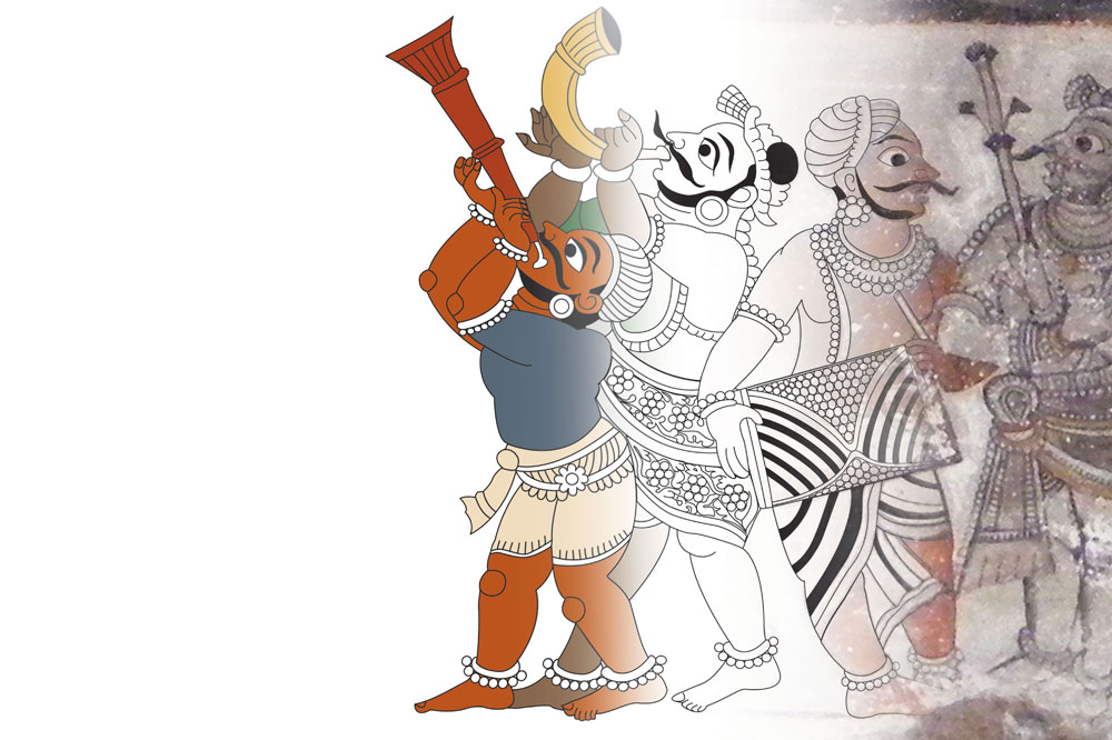 Bhaskar explained that in recent memory many mural painting sites have been conserved/restored using questionable methods. This has ranged from chemical cleaning, spraying protective coats, and in frequent and extreme cases, over painting – all of which are intrusive. Not being a professional conservator or restorer himself, Bhaskar has pursued his passion through grass root experience and self-driven studies. Towards extending his own professional skills of scientific illustration, he began to think about and explore murals using digital technologies. Over the years, Bhaskar has developed a special and complex digital technique to meticulously document mural paintings. As mural paintings occupy walls and ceilings that often stretch across hundreds of feet, it will be almost impossible to photograph them as a single picture. Bhaskar’s approach involves photographing murals in many small parts, and then digitally ‘stitching’ them together to make a whole. Once stitched, the paintings become intelligible, but not shareable due to the high image resolution. To facilitate this, Bhaskar will digitally trace the images using a stylus and touch pad as Scalable Vector Graphics (SVG). This line art shall serve as a valuable archival resource and will be used to investigate details of the murals—scenes, characters, costumes, and jewellery.