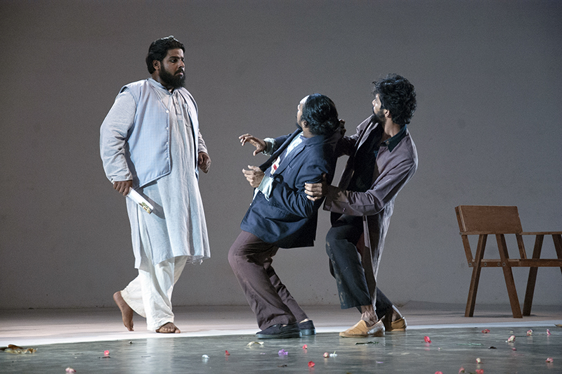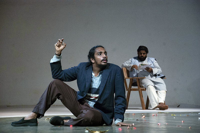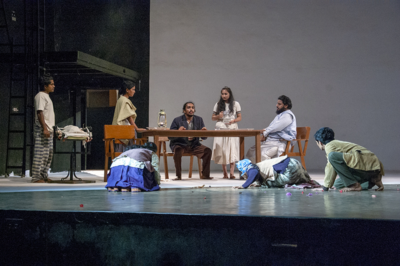 In April 2019, theatre director Sankar Venkateswaran came to teach at Ninasam. As a culmination of his work there, students made a presentation based on the play Interior. Sankar was initially attracted by this play for its poetic content, its unconventional theatricality and its use of ‘death’ as a metaphor. For this presentation, translations into Kannada were improvised by the students. In this presentation, Sankar attempted an acting idiom that was an innovative combination of the psycho-physical concentration of Kudiyattam and a slow and balanced pace of movement inspired by Noh theatre. Actors, audience, as well as Sankar discovered a new theatricality that was fresh and path breaking with this approach. The process also critiqued in an oblique way many of the current theatre practices and exposed the limitations of actor training methods, mainly in its pace and the way the body, mind and voice are connected.
