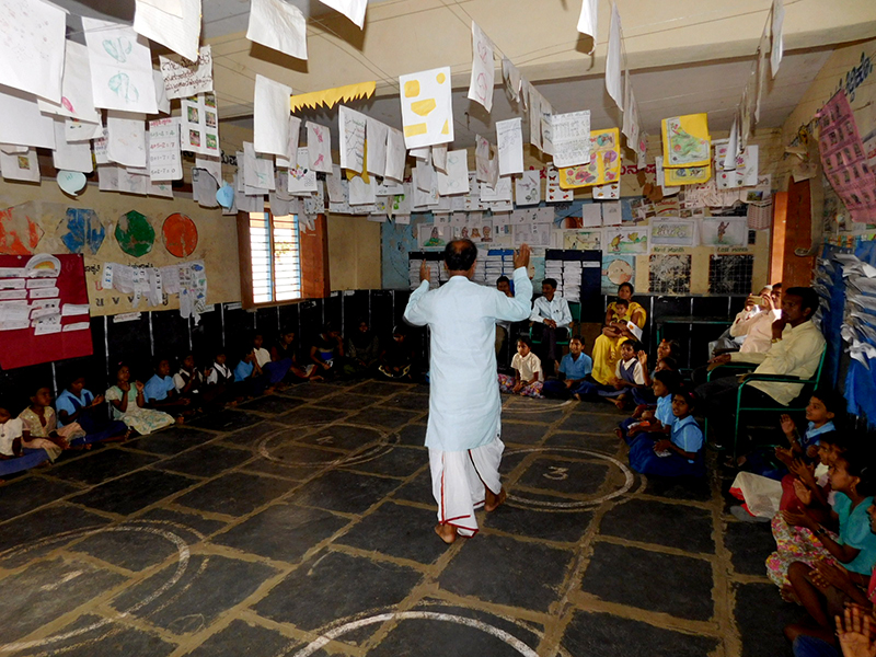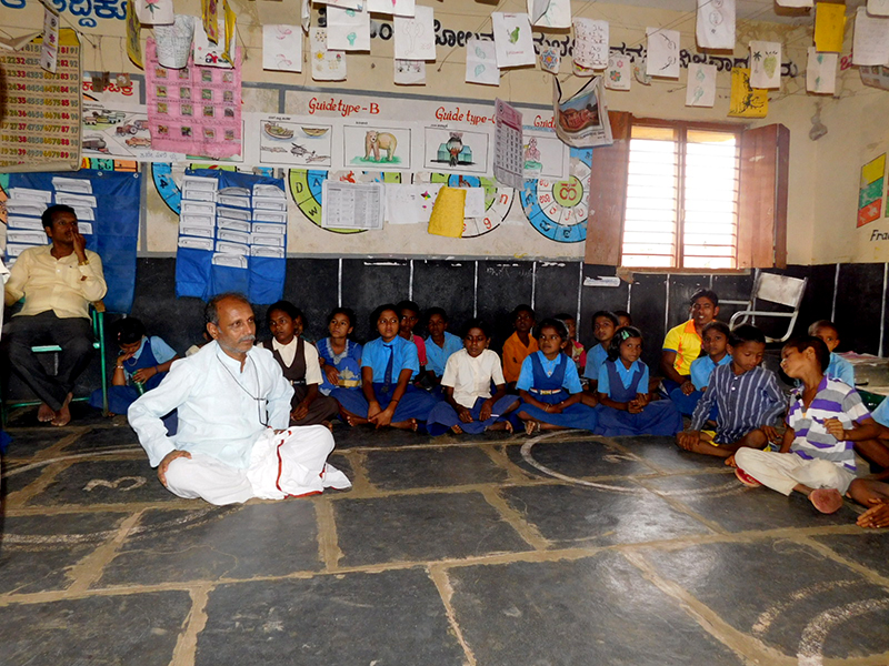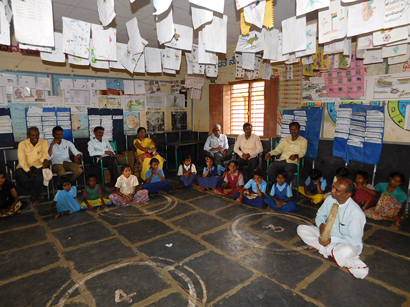 From the vast repertoire of folk arts in Karnataka, Shankarappa has selected two significant ones, Lavani and Geegi pada. Lavani is an 18th century singing ballad tradition that records local histories and stories of freedom fighters and heroes. In current times, we find Lavani songs about landscape, soil, water reservoirs, health and so on. Geegi pada is another singing form set in particular melodic and rhythm patterns. Apart from devotional lyrics, they also talk about everyday social and political concerns in the rural areas. Shankarappa wants to use these two forms to teach students their lessons from the curriculum. This will help the students remember their lessons better, as well as connect them to their local folk art forms. In addition to material from text books, Shankarappa will also teach lavani songs on freedom fighters and national leaders. Along with the students he is planning to train parents and teachers which will help them to spread this art form in their own schools and in the community. He will encourage students to imagine and write their own lyrics and set them to tune as well.