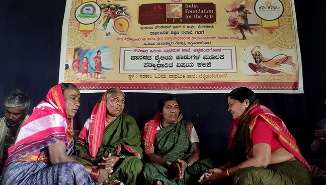 The common thread that links the various activities in the project is the involvement of the community singers. Siddayya’s mother Shantavva Kallayya Mathapati, Somappa Ulavappa Madalli, Budappa Basappa Patil and Siddaramayya Kashimath – all well-known singers of the region – will engage in workshops and discussions with the students. Siddayya will prepare textual documentation of the songs and provide them to the students and his peer cluster teachers. Aided by a series of workshops, the project will culminate in a public performance and a digital publication of different kinds of folk songs. Most importantly, this project introduces students to the life of community singers, and the schools to community resources. It also opens up the richness that exists in the indigenous knowledge systems within the community. The attempts to use the folk arts to re-energise the community’s relationship with education and school culture, and bring multiple stakeholders - teachers, School Development and Monitoring Committees (SDMC), and students - together to address social, cultural and educational challenges of the surrounding community.